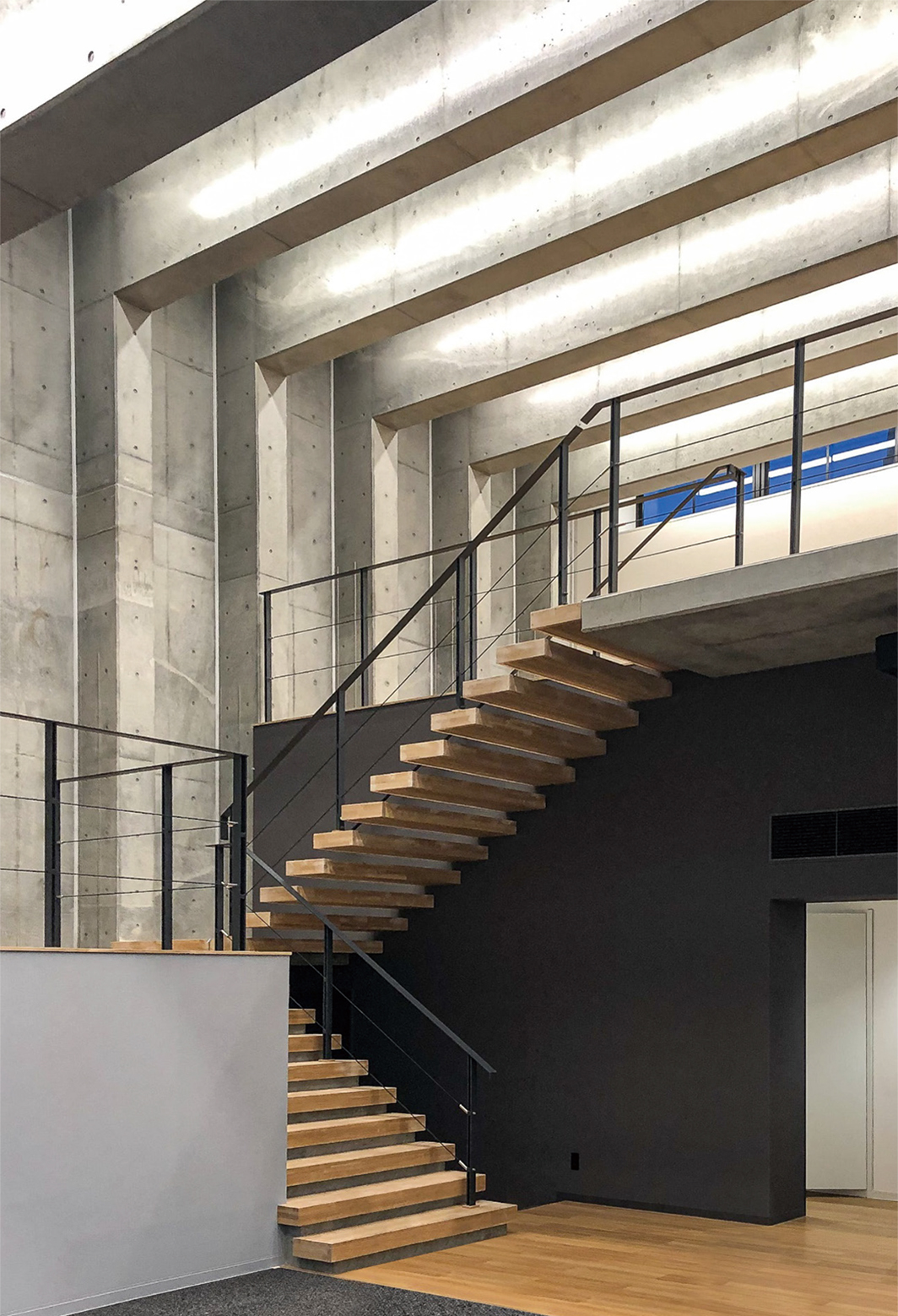 ボックス形状の各ゾーンをつなぐ階段は、それぞれの場を緩やかに柔らかく繋ぐために、そっと添えるように浮遊感のある設えとしました。片持ち階段を支持する側のササラを耐力壁内部に埋込とし、もう一方の側は施工中は仮設ササラを取付けて施工精度を確保して、タモ材の仕上の施工を行う直前で、コンクリートの硬化を確認したのち仮設ササラを取り外しました。