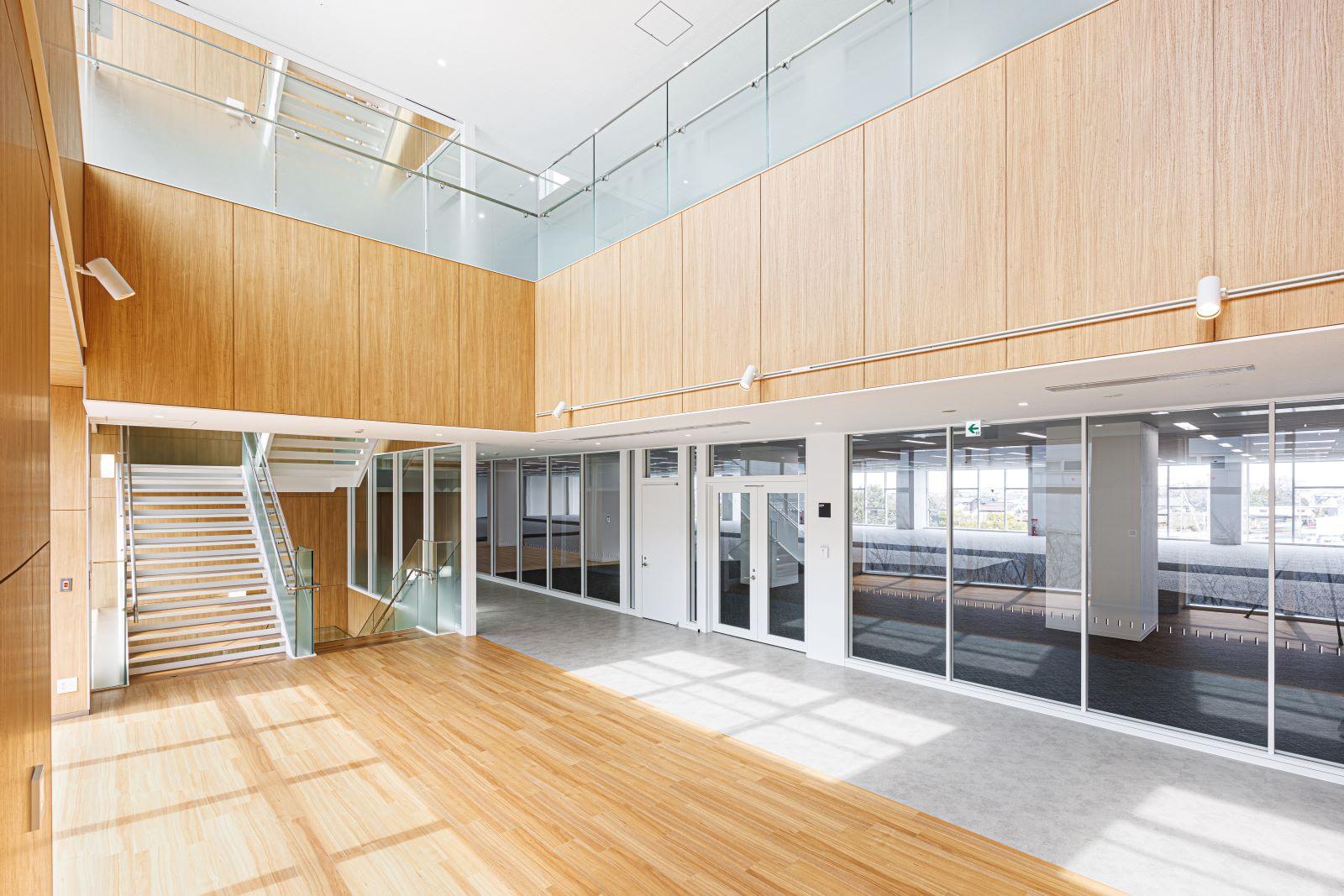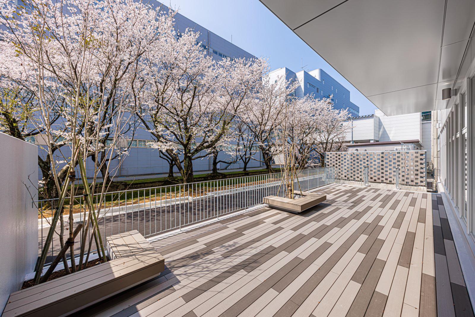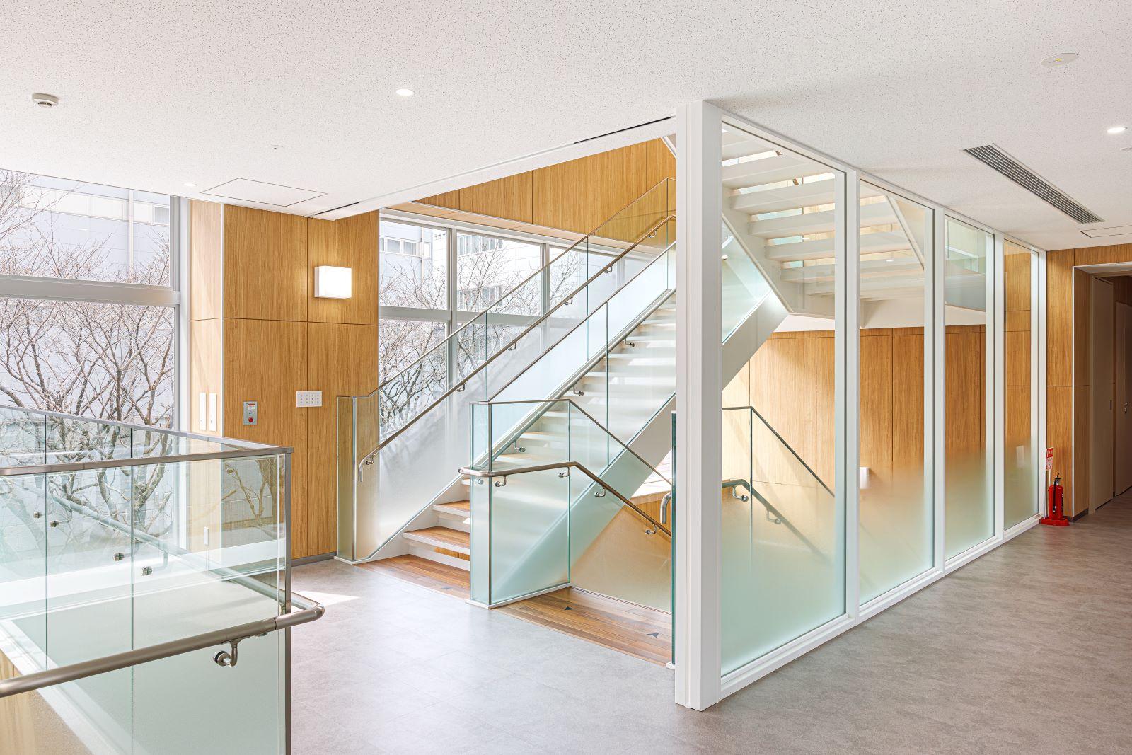 上下階をゆるやかに繋ぐリフレッシュゾーンや桜並木が鑑賞出来る屋外デッキ、白山連邦が望める来客ラウンジなど現地の自然を生かした新棟である。